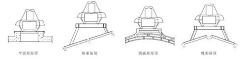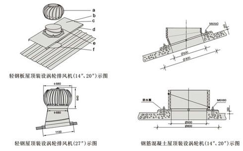 2、建筑物高度在 6米以下使用時效果較佳。 四、屋面安裝示圖說明 1、DWT-Ⅰ-Ⅱ-Ⅲ型屋頂風(fēng)機(jī)屋面安裝示圖說明 ![]() 2、DWT-Ⅳ(無電機(jī))屋頂渦輪排風(fēng)機(jī)屋面安裝示圖說明 為使渦輪機(jī)達(dá)到最高的效率,安裝的位置必須在屋頂?shù)母咛帲苊庋b設(shè)在護(hù)墻之后或可能被附近的高樓、樹木擋住風(fēng)勢的地方。 渦輪排風(fēng)機(jī)安裝指南: 1、排氣機(jī)的理想位置盡量靠近屋脊線,安裝時底板上傾邊緣端嵌入屋脊金屬蓋板下的縫隙里。 2、以底板內(nèi)孔為樣板面出洞口輪廓線,用切割機(jī)完成割屋面板洞口。 3 、嵌入底板,將底板用自攻釘(至少10顆)固定在屋面板上。將底板下傾邊緣端切割成與屋面板相同斷面波形折蓋空隙。 4 、裝上底座、用水平測量其底座上端部成水平再用自攻釘將底座及底板固定。 5 、排氣機(jī)套入底座端部以自攻釘固定排氣機(jī)。 6 、用玻璃膠將自釘及接合縫填補(bǔ)即完成安裝。 注意: 1 、每個排氣機(jī)的中心間距不小于3M。 2 、避免排氣機(jī)安裝于有亂流處,以及和垂直墻相鄰的低屋面外,炎熱區(qū)域需加裝其他排氣機(jī)以滿足特殊要求。 ![]() 注:14"內(nèi)徑為Φ300,外徑Φ460;20"Φ內(nèi)徑為Φ500外徑Φ620,27"內(nèi)徑為Φ600/680,外徑Φ840/880。 a、渦輪排風(fēng)機(jī) b、鋼板上緣必須插入脊梁的蓋板內(nèi) c、平面鋼板成型后必須大于安裝孔的面積 d、鋼板兩側(cè)向下折成直角,必須掩蓋屋面板的波峰 e、調(diào)整座 f、安裝孔 換氣計算示例